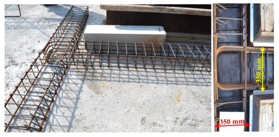 The geometric characteristics were common for all six specimens. The total length of the column was 3000 mm with a cross-section of 350/250 mm, and the total length of the beam was 1875 mm with a 350/250 mm cross-section, respectively. All specimens had four 14 mm diameter longitudinal bars in the column, one at each angle. All specimens had four longitudinal bars with a diameter of 12 mm placed on the top and bottom sides of the beam, except for JB1 and JB1Fxb, which had bars with a diameter of 14 mm. As transverse reinforcement, stirrups with a diameter of 8 mm per 100 mm were installed on both the column and the beam. The specimens JA0 and JA0Fxb had no stirrups in the joint area, while the others had one stirrup with an 8 mm diameter (Figure 1). The clean cover of both beams and columns in all tested specimens was 25 mm.