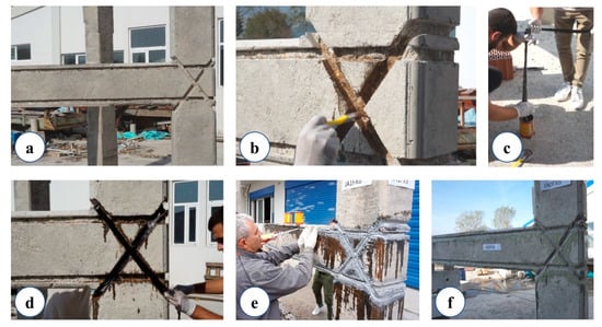 At first, the direction of the carbon fiber ropes was drawn on the surface of the specimens. With the use of a grinder, the incision of U-shaped notches was made according to the dimensions and specifications of the supplier of the material, in order to achieve the encapsulation of the CFRP ropes (Figure 2a).