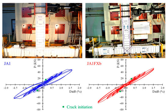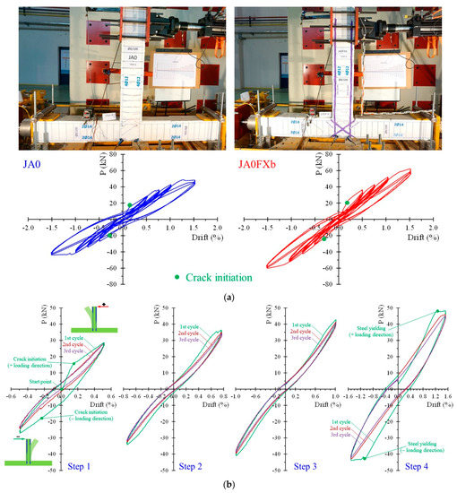 In order to comprehend some important details concerning the acquired experimental hysteretic response of the tested specimens, Figure 4b presents the load versus drift curves at each loading step of the reference specimen JA0. Each step includes three loading cycles. The start point and crack initiation points are noted in the diagram of the first cycle of step 1 for both loading directions (positive and negative), as illustrated in Figure 4b. Further, steel yielding due to damage propagation caused by the increased imposed load can also be noted in the diagram of the first cycle of step 4 (Figure 4b). The first cycle at each loading step is illustrated in Figure 4 using a green colored line.