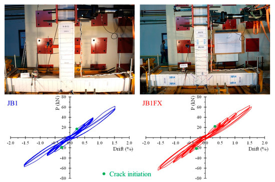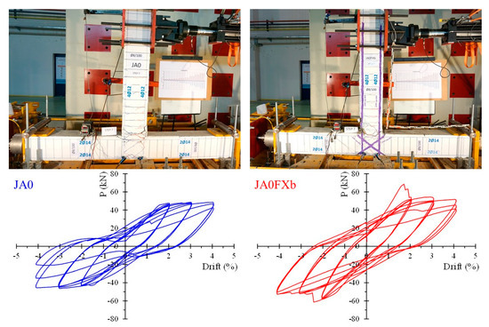 In the first loading step of the reference specimen JA0 (without any stirrups in the joint area), micro-cracking was observed in the beam region. The number and width of cracks in the beam increased as the steps progressed (steps 2 and 3). At the end of step 4, a slight diagonal crack appeared in the joint region. During the first four steps of the strengthened specimen JA0Fxb, cracking was detected in the beam region; however, the number of cracks was smaller, and had reduced width in comparison to the reference specimen JA0. The hysteretic response of the specimens indicates that the strengthened specimen had a considerably higher load-bearing capacity at each step (Figure 4a).