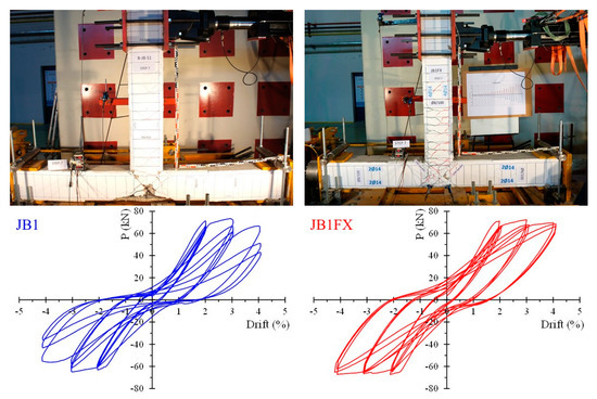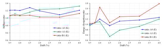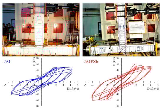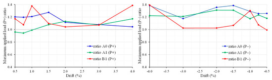 Figure 10 displays the curves of the maximum applied load (P) ratios calculated by the experimentally measured load capacity of the retrofitted specimens per each loading step/drift to the corresponding load of the reference specimens. The values of these ratios indicate the efficiency of the proposed strengthening technique with CFRP ropes, so that further conclusions can be drawn. More specifically, ratio A0 (P+/−) curves refer to the ratios of the maximum imposed load values per drift of the retrofitted specimen JA0Fxb to the corresponding load values of the reference specimen JA0. In the same manner, ratio A1 (P+/−) curves represent the load ratios of the retrofitted specimen JA1Fxb to the reference specimen JA1, and ratio B1 P(+/−) curves represent the load ratios of the retrofitted specimen JB1Fxb to the reference specimen JB1. These ratios for both positive (P+) and negative (P−) imposed load values are, in all examined cases, higher than 1. As such, the experimental results demonstrated in the diagrams of Figure 10 clearly reveal the ability of the applied CFRP ropes to enhance the load-bearing capacity of the tested joint subassemblages.