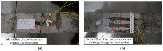 As the failure modes of each group of HBPFRC specimens are similar, the failure modes of B2P4 are selected to represent that of the other HBPFRC specimens. The failure modes of the control group specimen, the mono FRC specimen and the HBPFRC specimen are shown in Figure 4a–d.