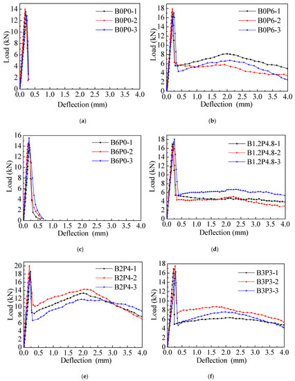 The load-deflection curves of each group of HBPFRC specimens are shown in Figure 5a–g. According to Figure 5a–g, it can be seen that for the control group specimen B0P0 and the mono-basalt FRC specimen B6P0, the load of which immediately decreased to zero after it reached the peak value. B0P0 and B6P0 showed obvious brittleness, and they fractured into two parts in the middle. However, compared with B0P0, the descending stage of B6P0 was relatively slow, indicating the brittleness of concrete is somewhat improved due to the addition of mono-BF.
