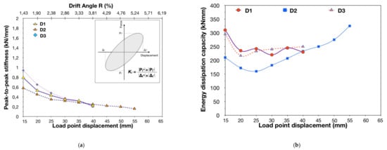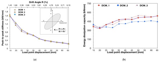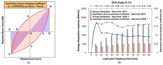 Figure 15a), which is related to deformability and to the inelastic characteristics of the structural member, while consisting of both the hysteretic and the elastic damping. It is noteworthy that the equivalent viscous damping ratio values are higher for structural members that possess dissipating hysteresis behavior. Contrarily, poor energy dissipation capacity may result in the collapse of the structural member due to the cumulative seismic energy under small deformations. Coefficient
