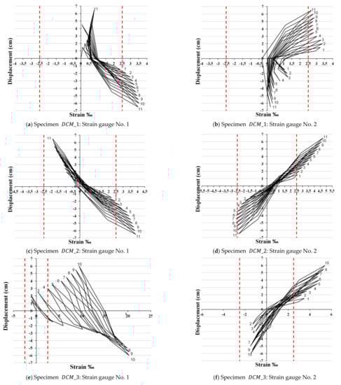 33]. The opposite is true for stable or decreasing strain values, which reflect hysteresis deterioration due to the slippage of the bars, as long as buckling has not taken place (see