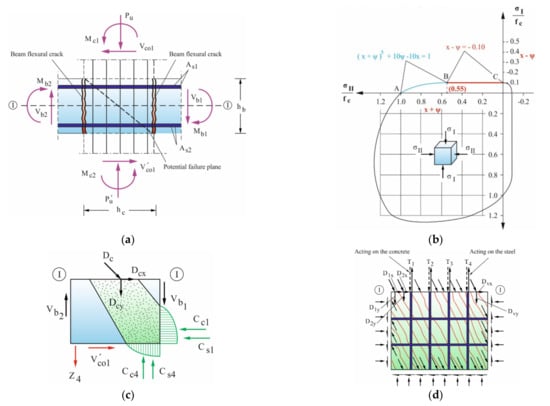 48], the shear forces acting in the core of a beam–column joint of a moment resisting RC frame during a seismic event are resisted in two ways, i.e., (i) partly by a diagonal compression strut acting between diagonally opposite corners of the joint core and (ii) partly by a truss mechanism formed by horizontal and vertical reinforcement and concrete compression struts. Therefore, the ultimate concrete strength of the joint core under tension/compression controls the ultimate strength of the connection, while after concrete failure the strength is limited by the gradual crushing along the cross-diagonal cracks, especially along the potential failure planes (see