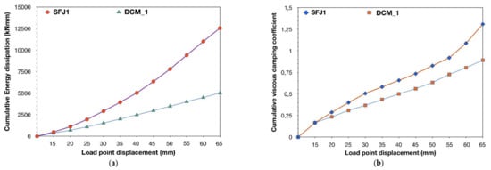 Figure 16a,b illustrates the cumulative dissipated energy and the cumulative equivalent viscous damping coefficient. As can be observed, the substantially increased energy dissipation capacity of subassemblage SFJ1 with respect to that of