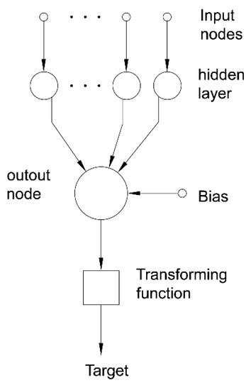 The ANN has been adopted and described exhaustively in the literature, e.g., in [40,41,42,43,44,45,46]. So, the fundamentals were only considered briefly in this paper. The most widely used ANN technique in civil engineering applications is the back-propagation networks (or B-ANN). The data flow from the input node to the output crossing a series of assumed hidden layer in which intermediate nodes are present in order to elaborate the inputs and make decisions related to the imposed bias. On the other hand, the error propagates in the opposite direction (from the computed output node to the inputs). In the propagation flow the weight and the bias are updated until the theoretical versus experimental scatter reaches a certain tolerance (small enough). The output node is then transformed by a non-linear function in the target, which is the outcome that the user is intended to predict. The relationships between the inputs and the outputs and the transforming function are typically written as reported in Equations (1) and (2), respectively.