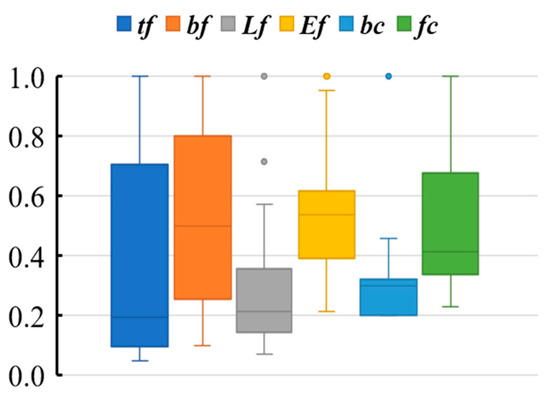 In the database, different typologies of specimens are considered, such as sheet, plate, laminate and in situ cured FRP. The considered parameters have been normalized with respect to the corresponding maximum value and the relative frequency distribution has been computed and reported in the box-plot graphs of the Figure 3. In addition, the interquartile range—IQR (i.e., the difference between the third and the first quartile)—is illustrated in Table 2 for each studied property. It is clear that the most investigated parameters are the dimension of the FRP-plate, namely tf and bf (i.e., larger IQR); on the other hand, the dimension of the substrate, bc, is generally the same in the experimental programs (i.e., IQR = 0.12) as well as the length (Lf) of the FRP bonded on the concrete block (i.e., IQR = 0.21). Finally, the mechanical proprieties of the FRP (Ef) and the concrete (fc) results were explored; in fact, an IQR equal to 0.34 and 0.23 was reached for the compressive strength of the concrete and the elastic modulus of the FRP, respectively.