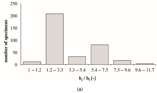 The database includes 368 specimens, with the highest frequency of β between 1.2 and 3.3 with a minimum value of 1.0 and a maximum of 20.0 (Figure 4a). The α factor presents the most populated range from 74.1 to 441.7 Figure 4b. The δ factor is the most regularly distributed in the database with the top frequency of 120 specimens in the 2.3–3.9 range (Figure 4c). In computing δ the Ef is considered in GPa while fc is expressed in MPa.