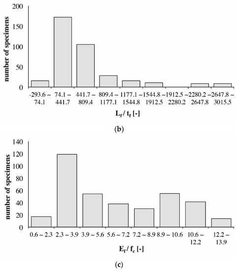 The ANN-procedure can perform a theoretical formulation for the determination of α based on the specimen mechanical and geometrical characteristics. Thus, three dimensionless parameters were introduced in the neural-networks in order to find out the relationship, which links them to the outcome α. The mentioned inputs are expressed in Equations (4)–(6) and the distribution of their frequency, represented by the number of specimens, is illustrated by the histograms reported in Figure 4. Specifically, β has been included in order to consider the effect of the stress distribution in the area around the FRP-plate, which is mostly affected by the ratio between the dimension of the FRP itself and that of the substrate (see [23,65,66,67]). Moreover, the γ factor considers the influence of the bonded length, that affects the bond strength in relation to the effective bond length [18]. Finally, the mechanical property of the FRP has been considered in Equation (6), according to [65].