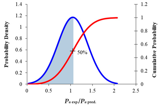 The theoretical value of the force Pu was then calculated by Equation (3). The frequency of the ratio between the experimental results and the predicted values is illustrated in Figure 5, where the normal distribution of the probability frequency (blue line) and the cumulative probability (red line) were both reported.