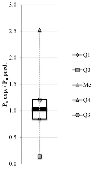 The domain of the Gaussian function can be divided into quartiles in order to obtain the box plot graph reported in Figure 6 and Table 3. Four quartiles are identified (Q0, Q1, Q2 and Q3) and the median (Me) is represented by a marked line. The range Q1–Q3 represents the box in which the 50% of the statistical population is contained while the range Q0–Q4 includes the whole domain. The mutual size of these two ranges provides information about the accuracy of the model; in fact, the smaller is the box respect to the domain the greater is the accuracy of the predictions of the proposed model. On the other hand, the position of the box gives a measure of the precision; in fact, if the box is located close to 1.0 it means that the theoretical values are close to the experimental ones and if the Me is centered in the box and close to 1.0 it means that most of the predictions tend to coincide with the target value (experimental).