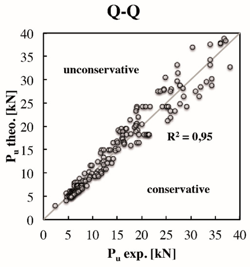 The grey area illustrated in Figure 8 is indicative of the validity of the model. A good match of the actual and predicted value of the Pu may be appreciated for the whole database. In particular, the specimens, with the worst forecast (i.e., larger scatter from the experimental relative result) are in the conservative side and represent the 15% of the whole population.