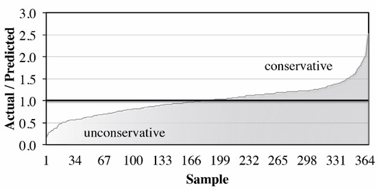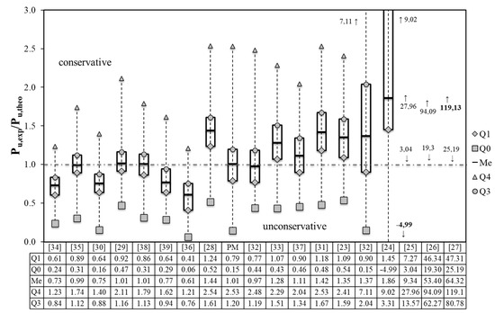 It should be remarked that Figure 13 and Table 4 are organized by reporting the increasing of the interquartile range (IQR), in order to obtain an immediate graphic evaluation of the models, as the smaller the IQR is, the more accurate the predictions are. The box-plot presents models with an increasing accuracy by starting from the left to the right in Figure 12 and from top to down in Table 5. Another key-issue is represented by the position of the box, which should be centered in when a precise prediction is found. For example, the models reported in [30,34] are characterized by the smallest dimension of the box, but distant from the unity, thus it can be considered an accurate, but not the precise proposal. Moreover, the position of the Me inside of the box indicates the type of predictions distribution in the Q–Q, namely symmetrical or not symmetrical. In fact, if Me is centered in the box, predictions are symmetrically disposed; it does not happen, for example, in the Chen and Teng model [30]. The kurtosis of the Gaussian curve is also calculated in Equation (15).