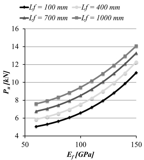 In Figure 9 and Figure 10 the iso-parametric curves are reported, by varying two fundamental variables, such as the elastic modulus of the FRP and the width of the concrete substrate; in the first case the isoperimetric curves are plotted for different bond lengths, in the second diagram different concrete grades are assumed. As expected, for a fixed value of the elastic modulus of the FRP-plate, if the bond length increases also the debonding force increases (until the limit of the effective bond length). Considering a single iso-parametric curve, with a priori definition of the active bond length, the greater is the entity of the Young’s modulus of the FRP-plate the greater is the force necessary to detach it from the concrete block. In fact, high quality of the fibers means minor elongation of the FRP sheet or major force for inducing e unitary deformation according to [68]. Obviously, the theoretical model is assessed in order to catch the proportional relation between parameters, but the bond length must be limited by an upper bound equal to the effective bond length, experimentally determined (see [28,29,30,36,39]).