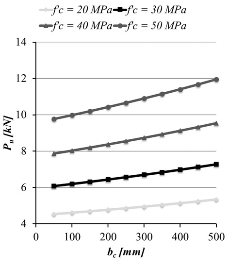 In Figure 10 the iso-parametric curves refer to constant values of the concrete compressive strength; the debonding load is plotted versus the width of the concrete block. The parametric study considers 20, 30, 40 and 50 MPa of the concrete compressive strength, which correspond to a value of the debonding force that increases up two times from 20 to 50 MPa of concrete resistance, at the same width. If the mechanical properties of the concrete increase, crack openings are delayed; therefore, the cohesive delamination within the concrete, that is the typical mode of failure occurs at higher load values. For example, concerning the 40 MPa compressive strength line, the increasing of the concrete width produces a small raise of the debonding force according to the experimental evidence (e.g., in [68]). Thus, the proposed model seems to be faithful to the trends that were found from the laboratory tests, as described in the literature database.
