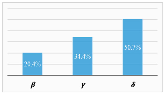 Further important consideration can be carried out from the calculation of the percentage increment of mean square error (%IncMSE). It refers to the mean increase of the accuracy of the theoretical model. The higher the %IncMSE is, the more important the parameter is that is involved in the global prediction of the target. It allows in finding the contribution a particular variable makes to the prediction of a criterion variable (target) in combination with other predictor variables according to Equation (14). The comparison of the %IncMSE for the imposed inputs is reported in Figure 12. It can be observed that δ is the input which more affect the accurate prediction of the outcome, while β and γ achieved comparable importance in the model performance. In other words, the bond strength is mostly affected by the mechanical properties of the FRP and the substrate. Contrarily, the substrate block dimensions less influenced the result, according to [68].