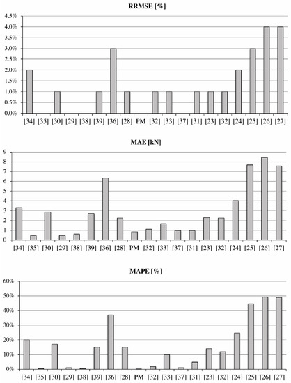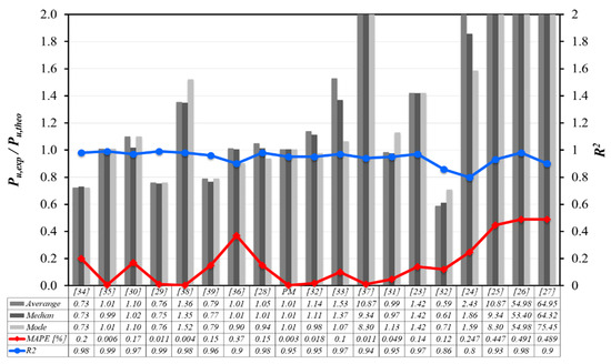 Thus, the position of the box plot provides information about the accuracy of the model: if the entire box plot is far from 1 it implies that experimental values are non-linearly related to the theoretical outcomes. On the other hand, the position of the box with respect to the Me specifies if the model is precise or not as well as the Pearson’s coefficients (as1, as2 and as3); the Kurtosis (K) gives a measure of the accuracy, i.e., the lower are the Pearson’s coefficients and the more precise is the prediction and contemporary the higher is the kurtosis the more is the accuracy of the prediction (see [46]). In Table 5, the best value of IQR (min), K (max) and as1, as2 and as3 (min) are reported in bold. The proposed model exhibits the maximum value of K and the minimum of as1, as2 and as3. Based on the present study, the less accurate predictions were provided by very dated proposals (i.e., [24,25,26,27]) that do not evidence the importance enough of the mechanical parameter of the FRP, disagreeing with Figure 12.