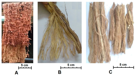 Once the bark is available in the form of fibrous almost-flat portions, as the one reported in Figure 2a, a water-retting process was adopted to remove fibres from the bark by allowing microbial degradation in the water [17]. The freshly matured stems were cut from the plant and the AC bark was soaked in water for 15–20 days, after which it was possible to obtain fibres that could be split, as in Figure 2b. After a further three days of soaking, the single fibres were arranged into bundles with different lengths, between 100 and 150 mm, and left to dry under the sun for around 6 h: these are shown in Figure 2c.