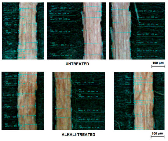Examples of diameter measurements along several untreated and alkali-treated fibres (the scales refer to all three images in a row).