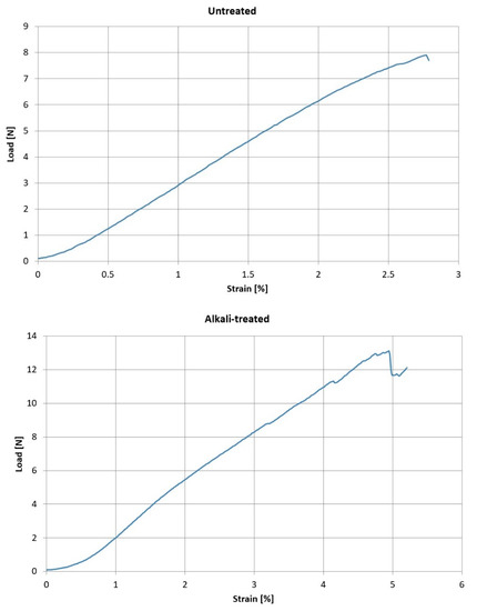 Fibres were then cut at a length of 125 mm to prepare them for mechanical testing. Typical curves obtained from untreated and alkali-treated fibres are reported in Figure 5. Considering the tensile strength results, which are reported in Table 4, the values obtained were lower than those measured in textile fibres, such as flax, where values of around 1200 MPa were encountered [29], while the elongation at break is always around a few percent of the initial length. This treatment results in some improvement of the ultimate load and of the elongation in a somewhat reduced scattering of the results. For ACB fibres, neglecting in the first instance the variability of the diameters, and considering the average diameter of the fibres and the average ultimate load, an ultimate stress equal to 852 MPa for untreated fibres and 937 MPa for treated fibres was observed, respectively. Data on elongation appear quite promising, considering that a number of investigations on the tensile performance of bark fibres did not indicate an elongation to break exceeding 2%, such as in the case of Calotropis Gigantea (L.) Dryand ex W.T. Aiton [30]. Alternatively, the variability of the ultimate stress for similar bark fibres showed variances largely superior to 100, i.e., a standard deviation exceeding 10% of the average value, as shown in Acacia Leucophloea Roxb. Willd. [31].