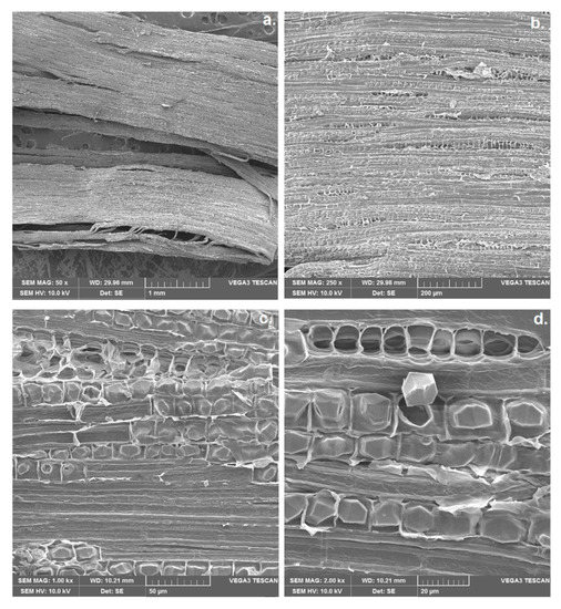 In Figure 6, the SEM micrographs of the fibre surface at different magnifications are represented. The ordered alignment of the fibres, and conversely the discontinuities in the bundles, were visible at lower magnification, in particular considering that only some parts of the bark were adapted to obtaining oriented fibre structures (Figure 6a,b). In contract, higher magnifications allowed for the identification of other features, such as the detachment of the hexagonal cells protecting the internal cellulose structure, most likely due to alkali treatment (Figure 6c,d) (e.g., in [32]). In Figure 7, the typical appearance of the surface of a further separated fibre, therefore adapted to the application of some tensile load, is depicted. The clear presence of striations, indicating boundaries between fibrils which are therefore likely to split during loading, was observable.