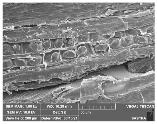 Scanning electron microscope (SEM) model Quanta 200 (FEI, Hillsboro, Oregon, United States), with a speeded voltage of 20 kV and a nominal vacuum level of 1.5 × 10−3 Pa, was employed. The fibre specimens, three untreated and three treated, were covered in a thin gold layer to prevent the accumulation of electrical charges during the examination. The purpose of the study with the SEM was to observe the surface morphology and evaluate whether the treatment produced any modification of the aspects of the fibres.