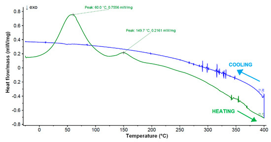 DSC scanning of a fibre sample (heating and cooling) over the temperature interval from −25 to 400 °C.