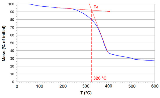 Thermogravimetric analysis (TGA) was used for the measurement of thermal stability and the temperature degradation interval of biofibres using a temperature scanning procedure. A STA 449 F3 Jupiter (STA 449 F3) (NETZSCH GmbH & Co. Holding KG, Selb, Germany) was used for analysis, which could accurately record the sample weight between room temperature and 1550 °C. In particular, in the course of this study, 5 mg of ACBF were heated in aluminium, their temperature increasing by 10 °C per minute from 30 to 550 °C. Nitrogen (N2) was delivered to the oven at a flow rate of 30 mL/min to preserve the inert environment.