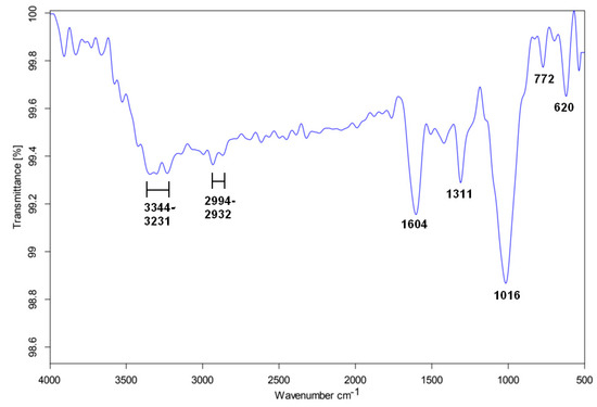 Regarding the identification of different components with further chemical characterisation, FTIR spectroscopy (Figure 10) indicated a number of regions and peaks of absorption. In particular, absorption bands at 3344–3231 cm−1 represented the stretching vibration of O-H, due to moisture content where lignin, hemicelluloses and cellulose presented the hydroxyl groups. The C-H stretching vibration in cellulose, hemicelluloses and lignin was identified in the spectrum at 2994–2932 cm−1 [36]. The very evident peak at 1604 cm−1 can be attributed to aromatic skeletal vibrations in lignin [37], possibly enhanced due to alkali treatment. The peak at 1311 cm−1 could be ascribed to the C-H bending of cellulose [38], whereas the sharp peak at 1016 cm−1 was elsewhere reported as characteristic of a C-O-C glucopyranose ring [39]. No peaks that corresponded to the presence of wax were identified.