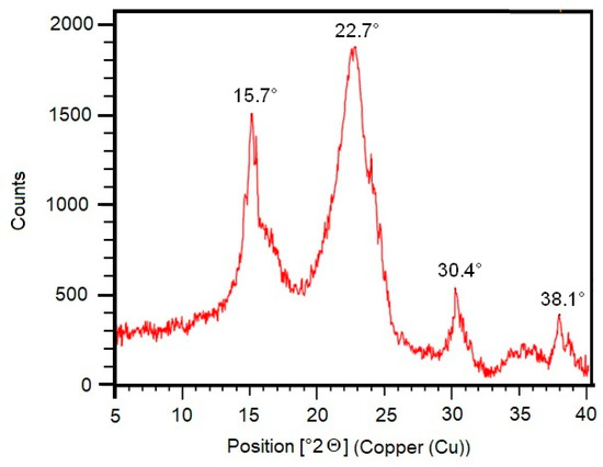 The alkali treatment of lignocellulosic fibres usually leads to the transformation from cellulose I to cellulose II [40]. From the XRD diagram in Figure 11, it is possible to see that the 002 crystalline cellulose peak is visible at around 22.7° and the amorphous cellulose peak (1-0-1 plane) at around 16°. According to Segal’s law [41], the crystallinity of the cellulose is obtained by the ratio offered by two respective intensities, I (I22.7-I16)/I22.7 = ~40%. This value was found to be just a little lower than what was found on other bark fibres recently investigated for applications in composites, whose outcomes are summarised in [42]. The two further and smaller peaks at around 30° and 38° were also observed, yet not commented on, in a study on Prosopis juliflora (Sw.) DC. [43]. Indications provided in [44] suggest that the presence of these peaks may refer to an increased level of order, as they were detected in the XRD spectra of cellulose microfibres, with respect to cellulosic banana plant waste.