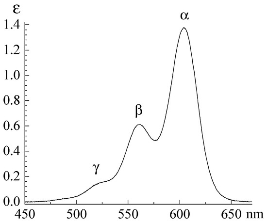 The dimension of molar absorption coefficient ε is L × mol−1 × cm−1 hereinafter. The quantum yield of fluorescence is 0.001 (λmax = 622 nm, methanol, excitation wavelength is 550 nm) [193]. The λmax and εmax values are traditionally assigned to the more energetically favorable cis-isomer (PIN isomerism will be discussed later). However, relaxation energy studies (excitation of molecules by 565 nm radiation) in ethanol medium also show sub-bands of absorption apparently inherent to the trans-isomer [148]. The rather developed PIN vibrational structure is more clearly visible in the absorption spectra (three bands, Figure 2) at low temperatures [193,195].