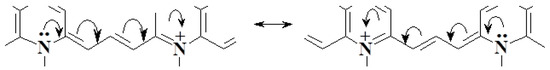 A slightly larger angle of rotation along the polymethine chain is given by calculations for the boundary resonance positions (alternating single and double bond) and calculations using non-empirical methods. For example, the rotation angle is 23.4° (the GIAO-HF/DFT method using the B3LYP/6-31G (d) basis [218]), or 8° (DFT/B3LYB, 6-31G basis [219]) and even ~36° (MM2 method and molecular orbitals calculation [202]). The transition of the cation to an excited state also entails disruption of the planar conformation [95,98,220].