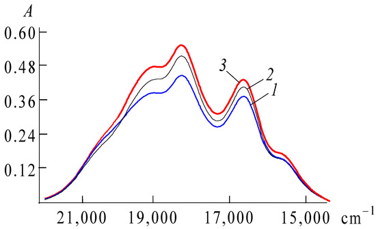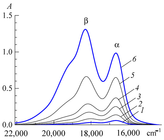 Redistribution of absorption band intensities of PIN in water. Concentration, mol/L: 2.1 × 10−6 (1), 4.1 × 10−6 (2), 6.2 × 10−6 (3), 8.2 × 10−6 (4), 1.9 × 10−5 (5), and 3.1 × 10−5 (6). The thickness of the absorbing layer is 1.00 cm; pH = 6.4.