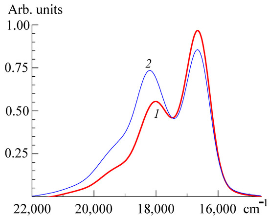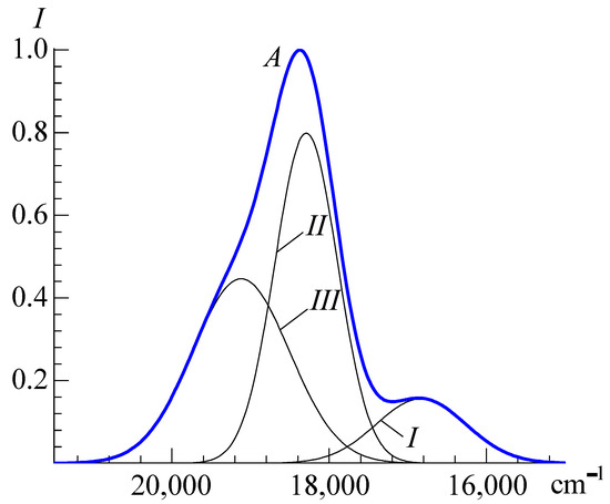 Spectrum A (Figure 7) has the following features: νmax, cm−1 = 18,380 (544.1 nm) and 16,840 (593.8 nm); and the surface area is 1712.0 cm−1. A comparison of the data in Table 2 and Table 3 shows that the α-band intensity in dimer (ID) is significantly lower than in monomer (IM), and the course of spectral changes in Figure 4 is explained by the increasing intensity of band IID and decreasing intensity of band ID. An analysis of the spectra of the monomer and dimer leads to an unobvious conclusion: even in the “monomer” PIN, the bands inherent to the dimer and H-aggregates (γ-band) are recognized [190]. This is indicated by the almost identical arrangement of the IIIM and IIID absorption bands, as well as the IVM band and the H-aggregate spectrum given in S. Sheppard’s publication [201]. The two-band spectrum of the dimer can be explained by Davydov’s splitting effect [216]. This is observed when two neighboring molecules are arranged at some (less than 90°) angle to each other [164,217]. The first of the bands is hypsochromic with respect to the monomer and is related to H-type self-aggregation (coplanar arrangement of chromophores, “one above the other”), while the bathochromic band is related to J-type self-aggregation (arrangement of chromophores in one plane, “adjacent to each other”).