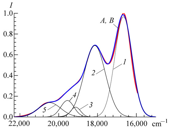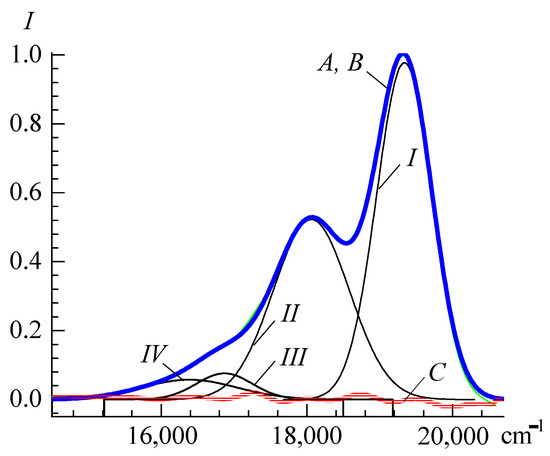 The very narrow corridor of the optical density difference curve (not more than ± 0.018 units, C = A − B) indicates the coincidence of the experimental (A) and total (B) light absorption curves and, therefore, the eligibility of the light absorption curve contour as a sum of four bands (Table 2). Spectrum B (Figure 6) has the following features: νmax, cm−1, 17,920 (558.0 nm) and 16,680 (599.5 nm); and the surface area is 1762.2 cm−1. Deconvolution calculation procedures may vary and the number of bands may be different. For example, the authors of Reference [202] point out that five bands are possible, but conclude that only three of them are significant. However, it must be considered whether there is a statistical difference between the parameters of each band and the error in the experimental determination of the light absorption intensity values (as a rule, not more than 3%), as well as the error in the calculation of the band area [207,208]. Furthermore, it makes sense to relate deconvolution results to the existence of one or another particle type (monomer, dimer, or self-aggregate) at specific dye concentrations. The consideration of these circumstances leads to the conclusion that four bands [190] are valid in the aqueous spectrum of PIN monomer. The ratio of the intensities of the maximums for the bands is as follows: IM:IIM:IIIM:IVM = 1:0.53:0.078:0.058. Meanwhile, the IVM band (νmax = 19,614 cm−1, λmax = 509.7 nm) indicates the existence of more aggregated forms of PIN, that is, H-aggregates (with νmax = 19,610 cm−1, λmax = 510 nm, and γ-band [201]). Note that the closely spaced bands IIIM and IVM have similar intensities. When the temperature rises from room temperature to 325 K [202], these bands practically merge into one, and the IM and IIM bands change insignificantly. A similar situation is observed for somewhat higher concentrations of PIN, even at normal temperatures (e.g., for 4.32 × 10−6 mol/L according to [176]); their ratio of band intensities was found to be 1:0.49:0.21. In the methanol medium [193], three bands of the general absorption spectrum contour were also identified. The ratios obtained from the experimentally measured spectrum of 1:0.305:0.052 (calculated as 1:0.305:0.047) are known. The normal-logarithmic deconvolution of the PIN spectrum (5 × 10−5 mol/L) also demonstrates three bands in the micelles of n-tetradecyltrimethylammonium bromide C14H38NBr [205].