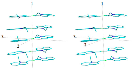 Isomerization is also possible for a dimer. In a cis-dimer, the ethyl radicals of the two cations point in the same direction. A trans-dimer is characterized by an opposite arrangement of ethyl radicals. Its cation planes are nearly coplanar, while for the cis-dimer, no predominant arrangement can be calculated. In the latter case, the total energy values of the two cations are found to be approximately the same for several different mutual arrangements of the two cations. For this reason, the trans-dimer is more energetically advantageous. The self-association of the PIN trans-dimer (Figure 9; stereo image; distance between the planes of the structure is equal to 3.7…3.8 Å; the energy is 79.1 kcal/mol, and MM+ method) leads to the experimentally observed H-aggregates [201,221].