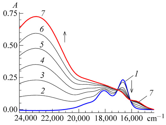 Absorption spectra in the system “Ct+ + BCP−”. Concentrations, mol/L; PIN, 4.4 × 10−6 (1–7); BCP, 0 (1), 3.1 × 10−6 (2), 5.0 × 10−6 (2), 1.0 × 10−5 (3), 1.5 × 10−5 (4), 2.0 × 10−5 (5), 2.6 × 10−5 (6), and 3.0 × 10−5 (7). The thickness of the absorbing layer is 1.0 cm; pH = 4.7. Comparison solutions are water.