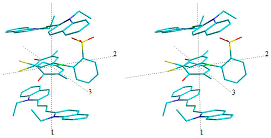 The rather high Kas values may indicate the formation of contact ionic associates in the solution. The dye association process is characterized by some deformation of the flattened π-electron system of the PIN (Figure 12; AM1 method; stereo image; the distance between neighboring marked in green ions is 4.6…5.0 Å, and the inner central angle with the vertex on the central carbon atom of the PIN polymethine chain equals 144°).