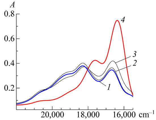 Absorption spectra in the system “Ct+ + BCP2−”. Concentrations, mol/L; PIN, 5.4 × 10−7 (1–4); BCP, 0 (1), 1.2 × 10−6 (2), 2.6 × 10−5 (3), and 5 × 10−5 (4). The thickness of the absorbing layer is 5.0 cm; pH = 9.1. Comparison solutions are water (1) and BCP solution at the appropriate concentration (2–4).