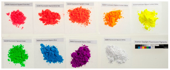 - Kremer Pigmente GmbH & Co Daylight Fluorescent Pigments. Available online: https://shop.kremerpigments.com/us/shop/pigments/pearlescent-effect-pigments/daylight-fluorescent-pigments/ (accessed on 20 January 2022).