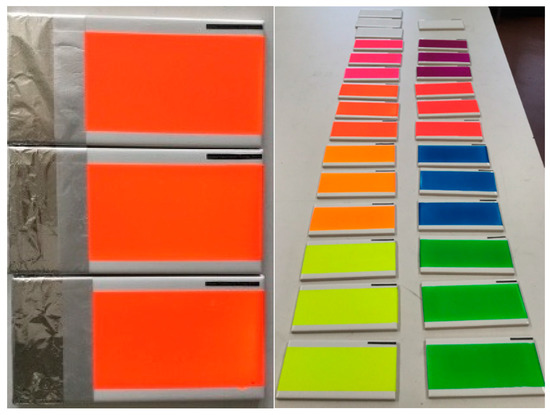 To control variables for this study, dry fluorescent pigments were used both without a binder and with a binder. Nine daylight fluorescent artists’ pigments were purchased from Kremer Pigmente (https://shop.kremerpigments.com/us/, New York, NY, USA) (Brick Red 56300, Flame Red 56350, Orange 56250, Golden Orange 56200, Lemon Yellow 56150, Green 56100, Blue 56050, Violet 56450, and White 56000) (Figure 1). White ceramic tiles (Restore Bright White 3 in. × 6 in. Ceramic Modular Wall Tile #734647960556 purchased from Home Depot (Buffalo, NY, USA) were used as the substrate. The tiles were chosen for their lack of UV-induced visible fluorescence under UV radiation and for their white color which would enhance the transparent fluorescent colorants. Additionally, the tiles are even, smooth, readily available, economical, and easy to clean. Samples with a binder were custom-mixed. The powdered colorants were mixed using a palette knife with Golden Acrylic Matte Medium purchased from Golden Artist’s Colors, Inc. (https://www.goldenpaints.com/, New Berlin, NY, USA) as a binder. The binder was chosen for its transparency, common availability as an artists’ medium, quick drying rate, lack of toxicity, and initial solubility in water. An amount of 2 g of dry pigment was mixed with 10 g of acrylic medium. An additional 1 mL of deionized water was used to improve the wetting of the pigments and prevent the drying of the acrylic medium during mixing. Scotch tape with a thickness of 0.058 mm was applied to either edge of the tile for a neat and even application. The paint was drawn down over the white tile using an aluminum spatula. The wet-film thickness was 0.058 mm, and the paint film covered an area on the tile of 6 cm × 15 cm (with minor variations). The samples were created in a room with low lighting and dried in the dark. Once dry, the samples were covered with aluminum foil on one side to prevent light exposure in this area (Figure 3). After aging, the aluminum foil was removed to allow analysis and imaging. Samples were stored in the dark between analyses.