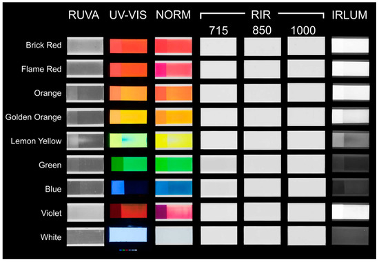 MMI was conducted on samples with binding media (aged and unaged) and on samples without binding media (unaged). MMI consists of a combination of imaging and lighting techniques that can be compiled to photographically capture how a particular material or paint responds and whether it emits, reflects, absorbs, and/or transmits in the visible or non-visible regions of the electromagnetic spectrum [30]. The nine colorants (with binder and aged, with binder and unaged, and without binder) were imaged using the following imaging techniques and following the workflow: normal illumination (NORM); long-wave ultraviolet-induced visible fluorescence (UV–Vis); reflected long-wave ultraviolet (RUVA); visible-induced near-infrared luminescence (IRLUM); and reflected near-infrared (RIR). Imaging was completed on a copy stand with the camera positioned directly above the samples. Image processing for exposure values was completed with the AIC PhD target and the UV Innovations™ Target-UV™ and executed in Adobe Bridge according to AIC standards [38,39]. Normal illumination imaging was conducted with a Nikon D810 UV–Vis–IR modified camera (MaxMax, https://maxmax.com/, Carlstadt, NJ, USA) with a 60 mm apochromatic Coastal Optical lens (Jenoptik: https://www.jenoptik.us/), two Profoto D1 500 W lamps (B&H Foto and Electronics Corp., https://www.bhphotovideo.com/, New York, NY, USA) positioned at 25-degree angles, and an X-Nite CC1 filter (MaxMax, https://maxmax.com/, Carlstadt, NJ, USA). RUVA and UV–Vis imaging was conducted using a Nikon D810 and two longwave UVA lamps (Low-pressure Mercury UVA lamp peak/368 nm, 250 W purchased from UV Systems, Inc., https://www.uvsystems.com/, Renton, WA, USA), positioned at 45-degree angles on either side of the sample. An X-Nite CC1, PECA 918 (PECA Products Inc., http://www.ir-uv.com/918.html), and Kodak Wratten 2E filter (Kodak, https://www.kodak.com) were used for UV–Vis. For RUVA, an X-Nite CC1 and BW 403 filter (B & H Foto and Electronics Corp. https://www.bhphotovideo.com/, New York, NY, USA) were used. For both RUVA and UV–Vis, the UV lamps were turned on one hour prior to imaging to warm up and create a uniform light source, demonstrated to achieve more consistent results [40]. To prevent unnecessary fading and protect the samples, the samples were only exposed to any lighting including UV during the brief time of the image capture; at other times, they were covered with a black foam board. During the imaging process, the pigments exhibited such bright fluorescence that processing them with the UV Innovations™ Target-UV™ Ultra setting still provided overexposed images [41]. As a result, the exposure time was reduced from 1.3 s to 0.5 s for Golden Orange and to 0.6 s for all other colorants to obtain usable and more accurate images. Figure 2 illustrates the overexposure and reduction in exposure time as well as the differences in color related to exposure. IRLUM imaging uses visible light as the source of excitation energy and captures the emission of IR energy [30]. Imaging was conducted using a Nikon D810 and one Powersmith Work LED light filtered with two 6 ½″ × 6 ½″ 3 mm-thick Schott BG 38 filters (Edmund Optics Inc., https://www.edmundoptics.com/). RIR imaging was conducted with a Nikon D 810 with X-Nite 715 nm, 850 nm, and 1000 nm filters, each separately (MaxMax, https://maxmax.com/, Carlstadt, NJ, USA). Two Profoto D1 500W lights were used. The lighting angle was 25 degrees on each side. Table 3 summarizes the settings and instrumentation for convenience.