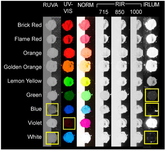 Kremer dry pigments (unaged) with no binder arranged by imaging technique (including filter cut-off in nm for RIR and IRLUM) and pigment color (red to violet). Pigments exhibiting significant differences in the spectral response captured by the camera are indicated by yellow rectangles.