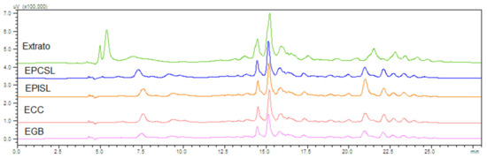 A greater separation would be obtained through saponification, removing the lipids and chlorophylls associated with carotenoids [32]. Nevertheless, this procedure leads to a significant loss in other carotenoids, interfering with the result, and was not feasible with the incorporated extracts due to the reduced sample quantity. However, it can be noted that, in the formulations, the first peaks appeared separated and with better resolution. These samples passed through additional steps that had not occurred with red bell pepper extract, such as emulsification, freeze-drying, and sonication, which may interfere with the final profile.