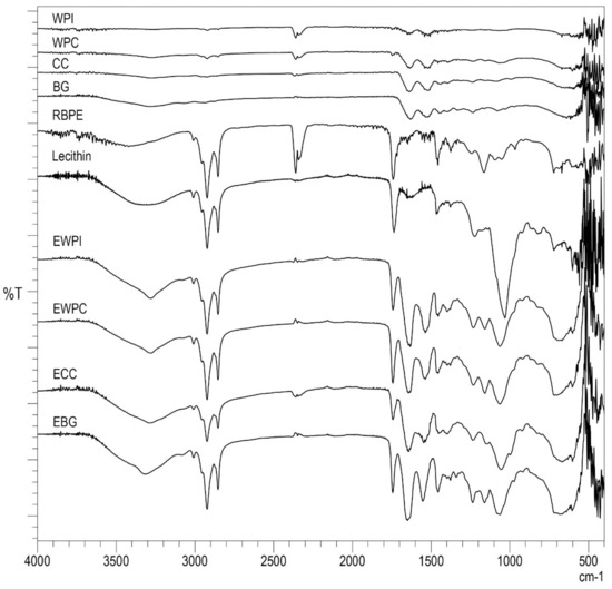 Regarding WPI, WPC, CC, and BG, the spectra showed weak bands of approximately 90–95% transmittance, with similar profiles. Prominent bands were observed nearly at 3288, 1635, and 1520 cm−1 and are related to O-H bonds, and N-H bending is related to amide I and amide II, respectively [40].