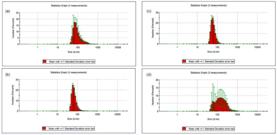 Results indicated that the nanoparticles of EWPI (Figure 3b) and EWPC (c) presented a better performance for this specific composition and technique. At the same time, ECC (a) and EBG (d) formulations demonstrated the largest particle size and a more heterogeneous distribution profile. Gelatin and caseins present few secondary structures and tend to adsorb as linear polymers. Thereby, their arrangements are more prominent and allow greater interaction with the aqueous phase when compared to globular proteins [47], which may have contributed to the increase in size. Furthermore, during this analysis, the samples did not pass by filtration, centrifugation, or another method that could select particles, indicating that these results reproduce the conditions of dispersing the samples in an aqueous based system.