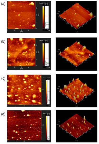 The particles presented soft surfaces, except for EBG, which showed a rigid and uniform appearance. EBG samples (Figure 4d) exhibited small spherical particles with sizes from 10 to 140 nm, contrary to the values obtained in DLS analysis, where EBG demonstrated the highest particle sizes. These results may suggest that, according to the medium where it was applied, EBG presents different characteristics. For instance, DLS analyses were performed in an aqueous medium, promoting the hydration of particles and consequently increasing particle size. On the other hand, AFM was performed with dried samples, which may explain a retraction in particle size.
