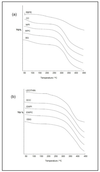 (a) TG curves of red bell pepper extract (RBPE), calcium caseinate (CC), whey protein isolate (WPI), whey protein concentrate (WPC), bovine gelatin (BG), and (b) TG curves of soy lecithin (Lecithin) and nanoparticles (EWPI, EWPC, ECC, EBG).